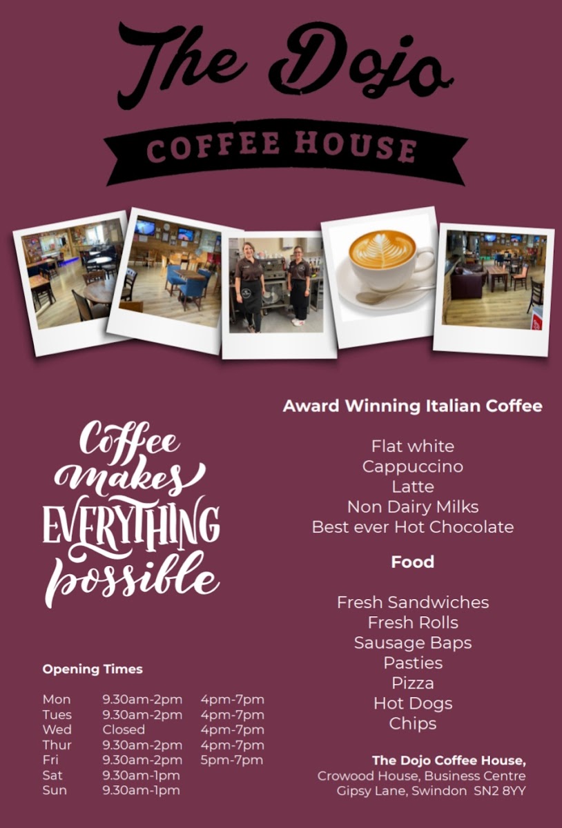 Welcome to The Dojo Coffee House, an inviting café located in Crowood House, Swindon. This cozy spot takes pride in creating a unique atmosphere where community thrives alongside delicious offerings. The menu boasts a delightful selection of beverages, including rich Hot Chocolate and expertly crafted Coffees like the Flat White and Mocha, all sourced from quality ingredients. For those looking to satisfy their hunger, the food options are equally impressive, featuring Fresh Sandwiches, Sausage Baps, and delectable Pizzas with vegetarian options.